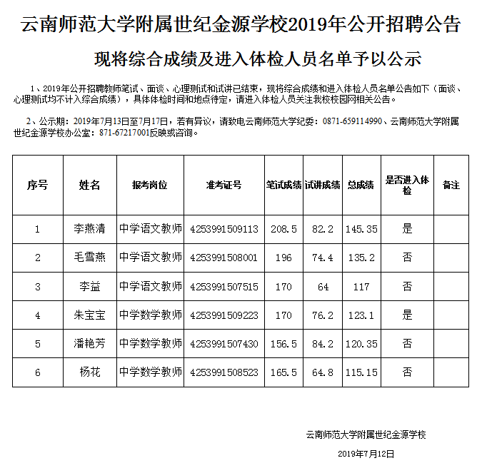 云南師范大學附屬世紀金源學校2019年公開招聘公告 現(xiàn)將綜合成績及進入體檢人員名單予以公示
