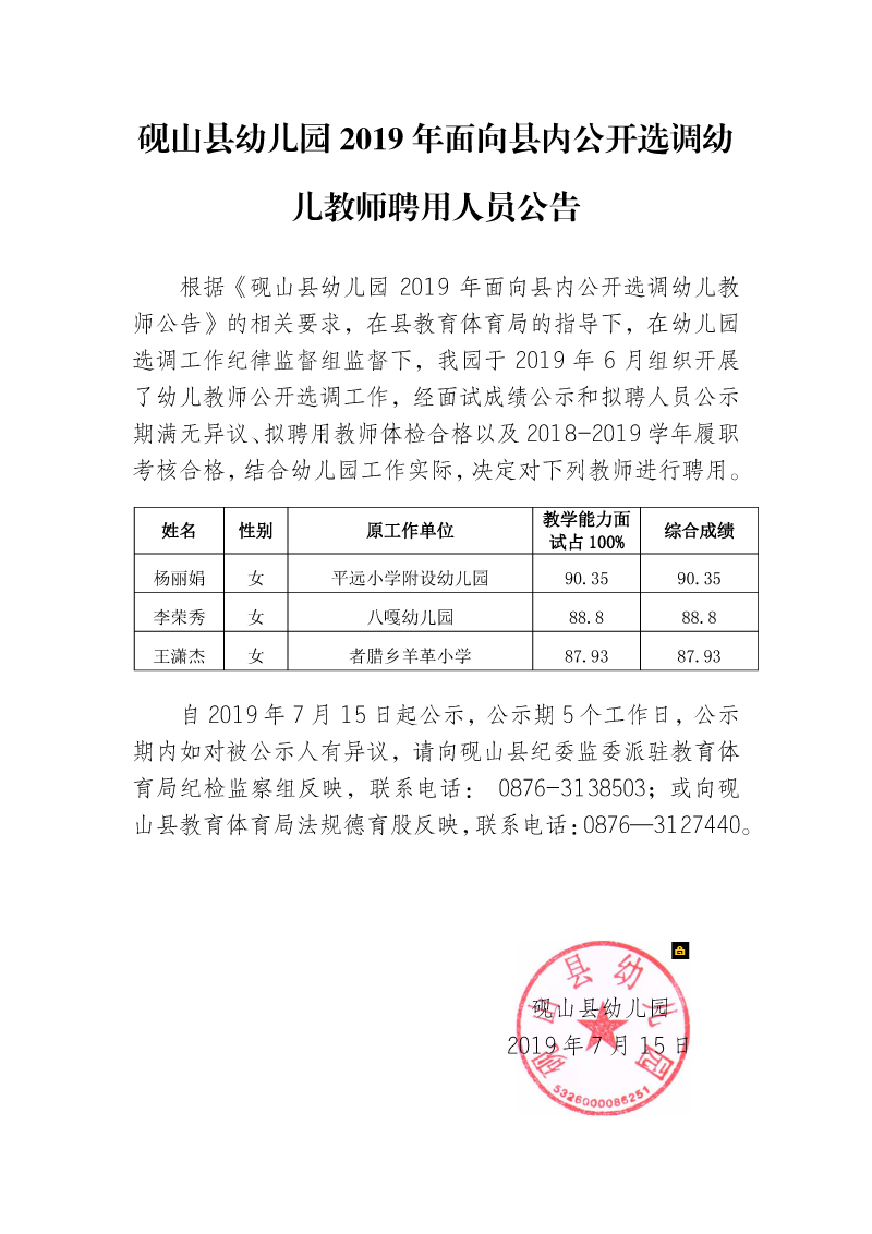 硯山縣幼兒園2019年面向縣內(nèi)公開選調(diào)幼兒教師聘用人員公告
