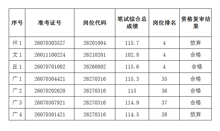 根據(jù)《2019年文山州事業(yè)單位公開(kāi)招聘工作人員通告》、《2019年文山州事業(yè)單位公開(kāi)招聘工作人員筆試成績(jī)最低控制分?jǐn)?shù)及資格復(fù)審有關(guān)事項(xiàng)的通告》要求,7月19日全州事業(yè)單位公開(kāi)招聘工作人員資格復(fù)審第2次遞補(bǔ)工作已結(jié)束,現(xiàn)將資格復(fù)審結(jié)果名單公布如下: