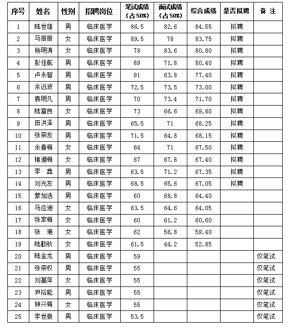 麻栗坡縣人民醫(yī)院2019年公開招聘編外人員成績(jī)及擬聘人員公示