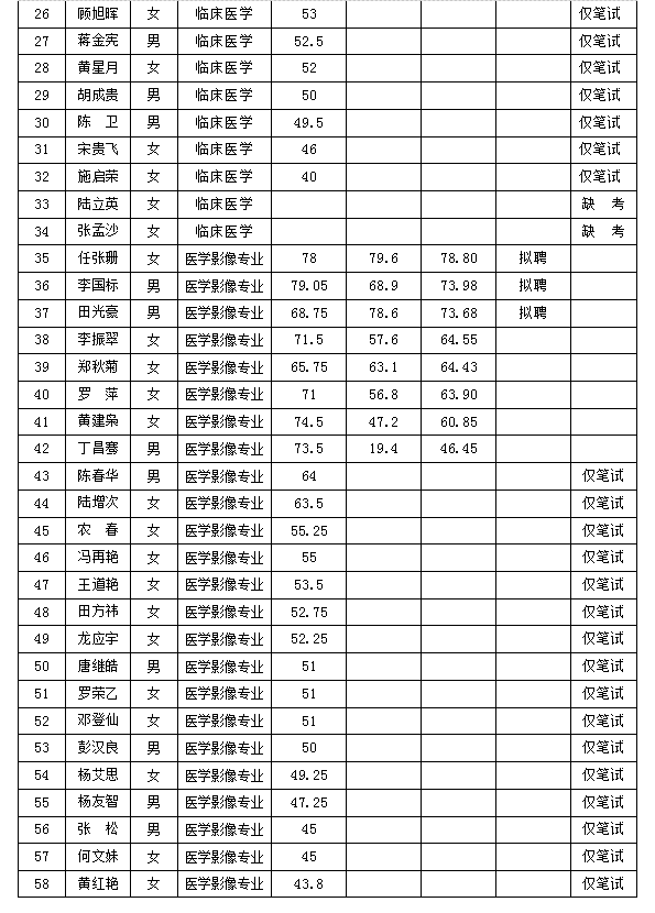 根據(jù)《麻栗坡縣人民醫(yī)院2019年公開招聘編外衛(wèi)生專業(yè)技術(shù)人員公告》,現(xiàn)將考試成績(jī)及擬聘人員名單公示如下: