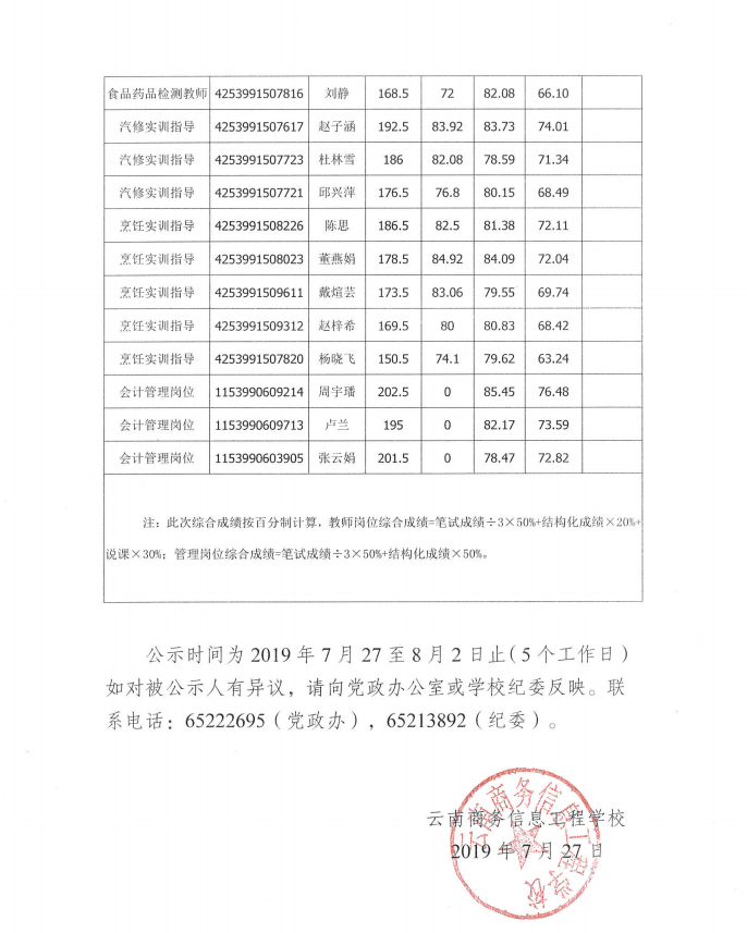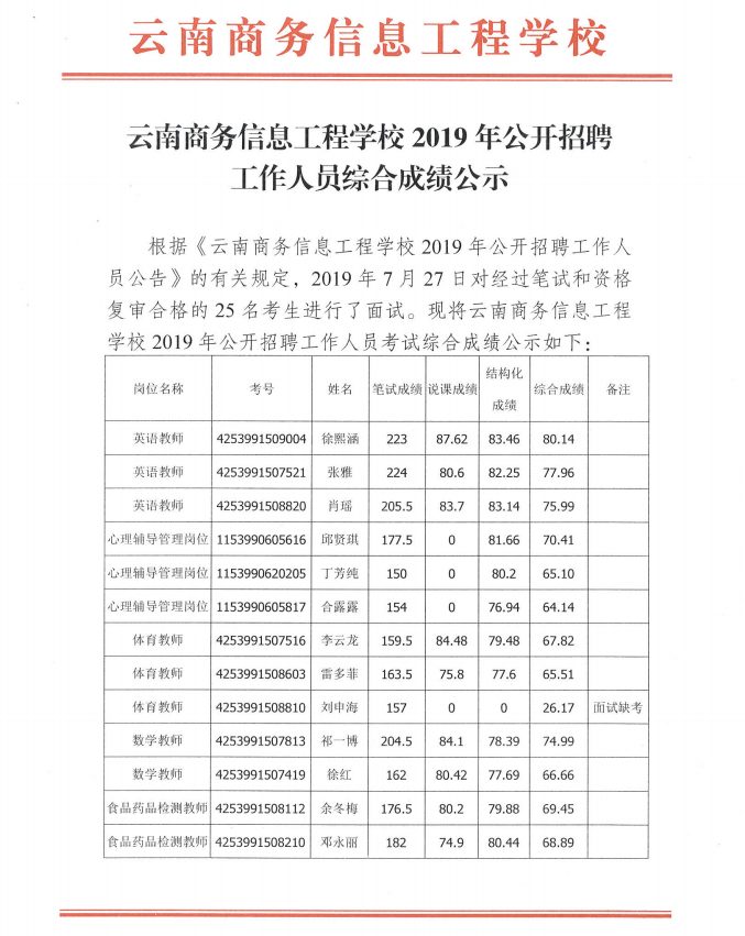 云南商務(wù)信息工程學(xué)校2019年招聘綜合成績(jī)公示