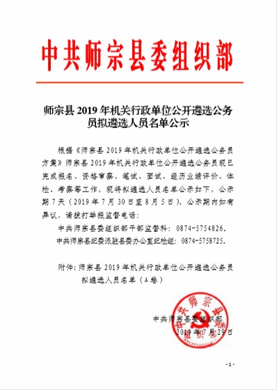 師宗縣2019 年機(jī)關(guān)行政單位公開(kāi)遴選公務(wù)員擬遴選人員名單公示