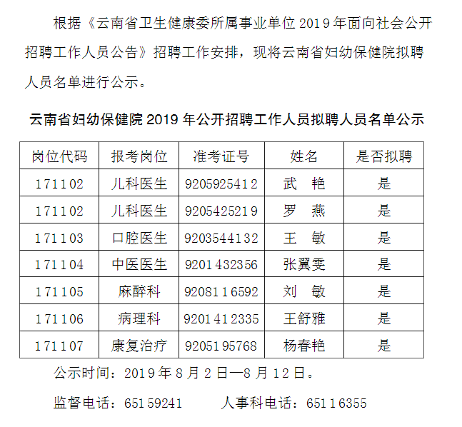 云南省婦幼保健院2019年面向社會(huì)公開招聘事業(yè)編制工作人員擬聘人員名單公示