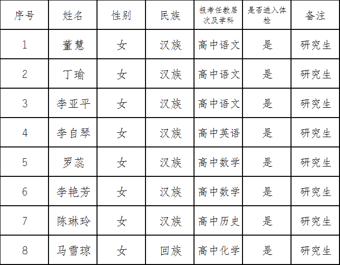 根據(jù)《曲靖市沾益區(qū)教育體育局所屬中學(xué)2019年公開招聘教師實(shí)施方案公告》的相關(guān)規(guī)定,現(xiàn)將曲靖市沾益區(qū)教育體育局所屬中學(xué)2019年公開招聘教師擬進(jìn)入體檢人員名單公告如下: