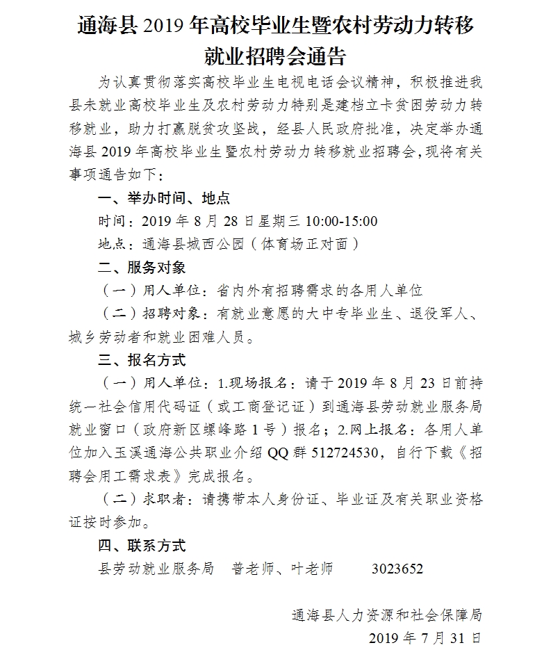 玉溪市通??h2019年高校畢業(yè)生暨農(nóng)村勞動(dòng)力轉(zhuǎn)移就業(yè)招聘會(huì)通告