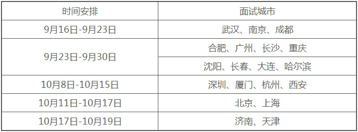 注:面試地點(diǎn)將根據(jù)投遞崗位時(shí)填寫的面試城市統(tǒng)一安排,具體面試時(shí)間及地點(diǎn)以后續(xù)通知為準(zhǔn)