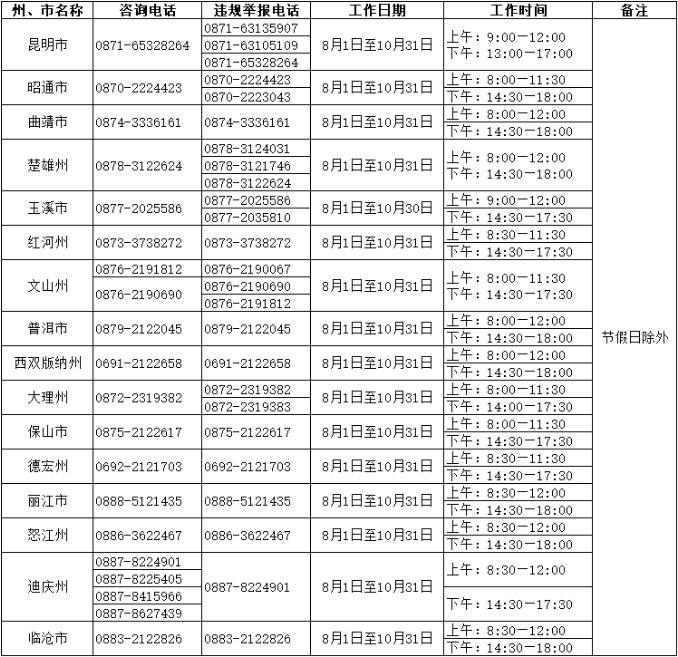云南省2019年中等職業(yè)學校招生錄取期間各州、市咨詢及違規(guī)舉報聯(lián)系方式