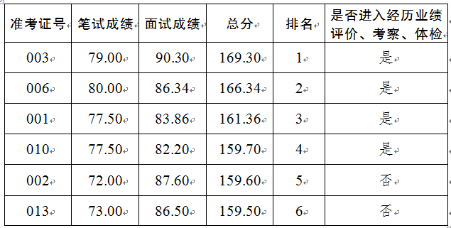 按照《中共西雙版納州紀(jì)委西雙版納州監(jiān)委2019年公開遴選公務(wù)員公告》相關(guān)程序,州紀(jì)委州監(jiān)委于8月12日上午組織報(bào)考人員進(jìn)行面試。根據(jù)筆試成績從高分到低分的順序,以1:3的比例確定面試人選,共6名同志進(jìn)入面試,實(shí)際參加面試6人?,F(xiàn)將面試成績公示如下: