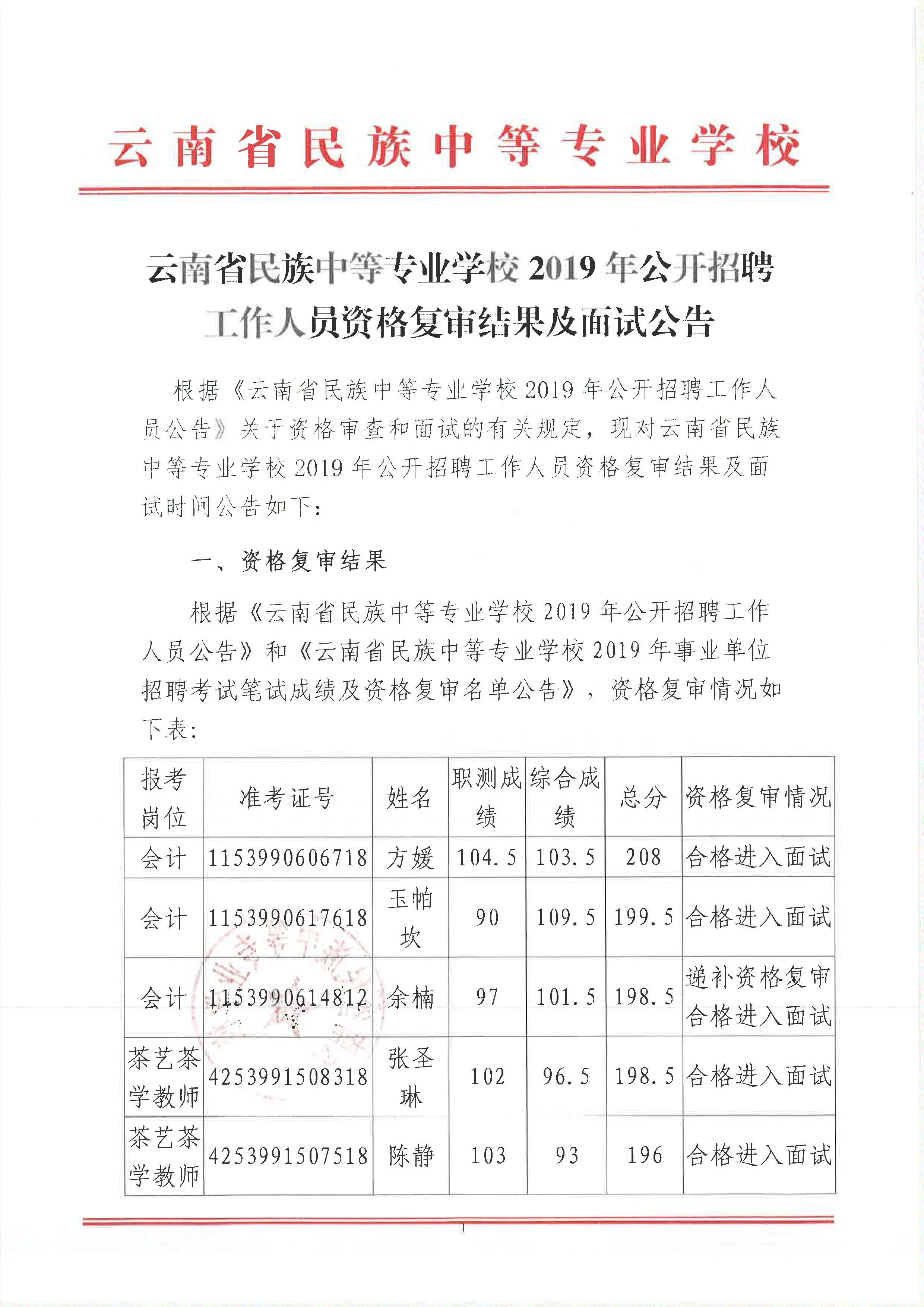 云南省民族中等專業(yè)學校2019年招聘資格復審結(jié)果及面試公告