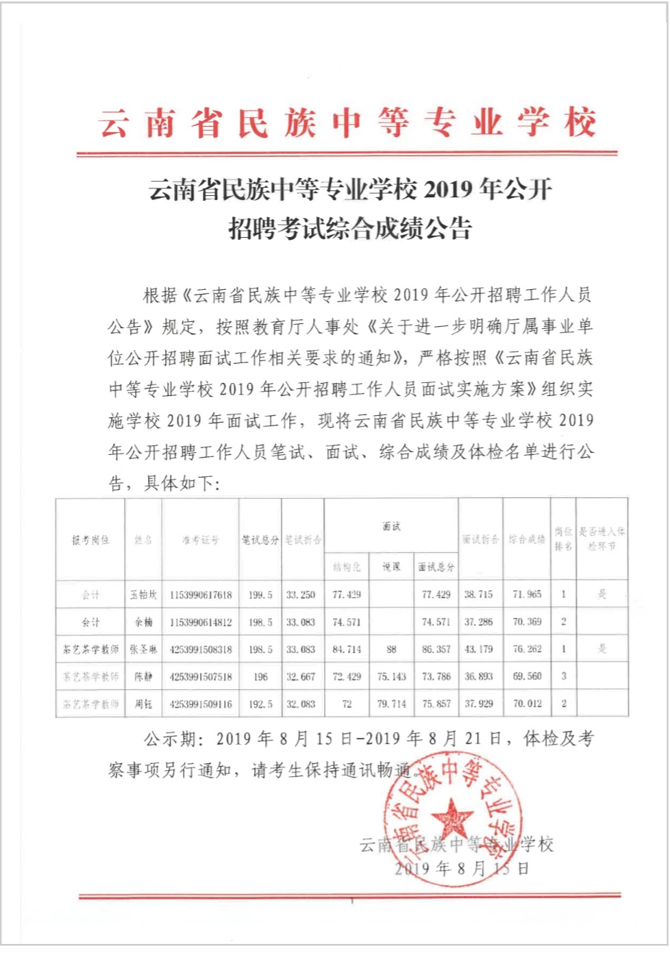 云南省民族中等專業(yè)學校2019年招聘考試綜合成績公告