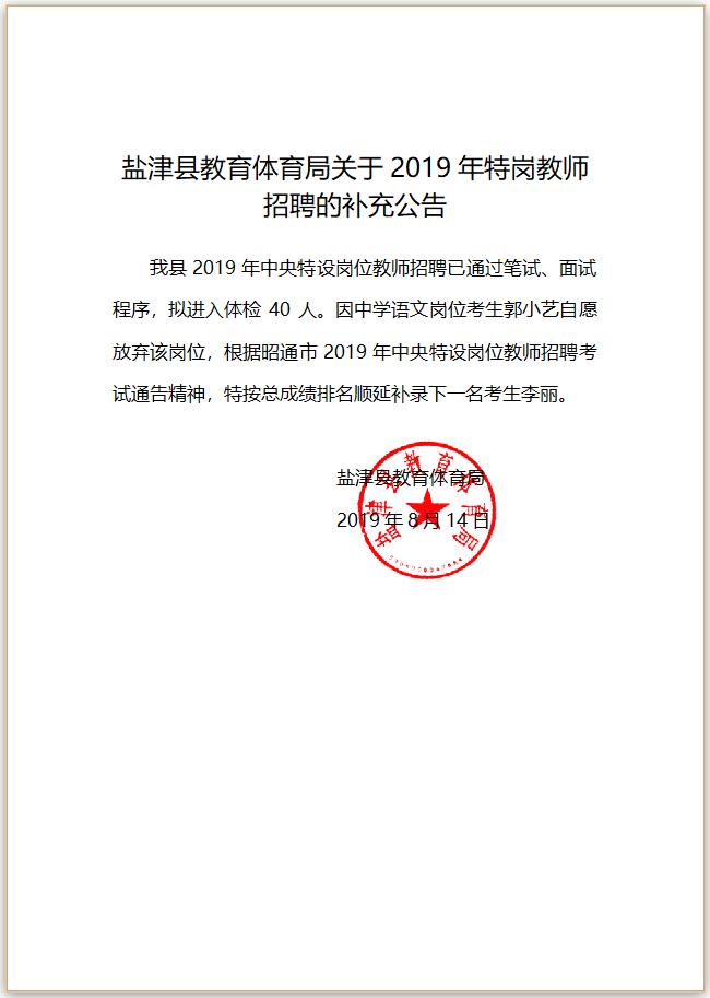 昭通市鹽津縣教育體育局2019年特崗教師招聘補充公告