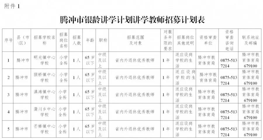 2019年騰沖市計(jì)劃招募“銀齡講學(xué)計(jì)劃”講學(xué)教師5名,全部為小學(xué)崗位。具體崗位詳見(jiàn)《騰沖市銀齡講學(xué)計(jì)劃講學(xué)教師招募計(jì)劃表》(附件1)。