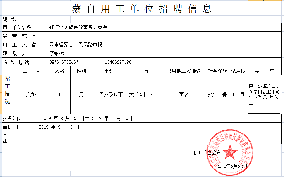 2019年蒙自市紅河州民族宗教事務(wù)委員會招聘信息