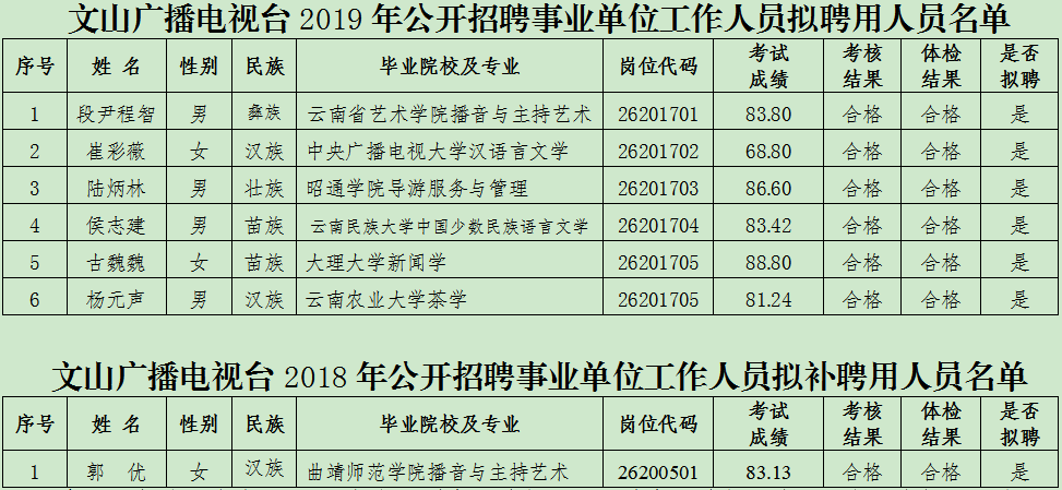 根據(jù)《2018年文山州事業(yè)單位公開招聘工作人員通告》《2019年文山州事業(yè)單位公開招聘工作人員通告》和《云南省事業(yè)單位公開招聘工作人員辦法》(云人社發(fā)〔2016〕182號)、《云南省事業(yè)單位公開招聘工作人員面試測評暫行辦法》(云人社發(fā)〔2016〕405號)的有關(guān)規(guī)定,經(jīng)面試考試、考察和體檢合格,現(xiàn)將文山廣播電視臺2019年公開招聘事業(yè)單位工作人員擬聘用人員名單及2018年公開招聘事業(yè)單位工作人員擬補(bǔ)聘用人員名單公示如下,公示時間7個工作日(2019年8月29日至2019年9月6日)。