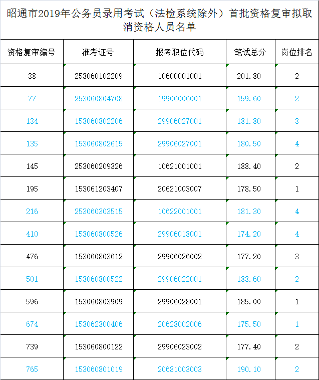 昭通市2019年公務(wù)員錄用考試 (法檢系統(tǒng)除外)首批資格復(fù)審擬取消資格人員名單