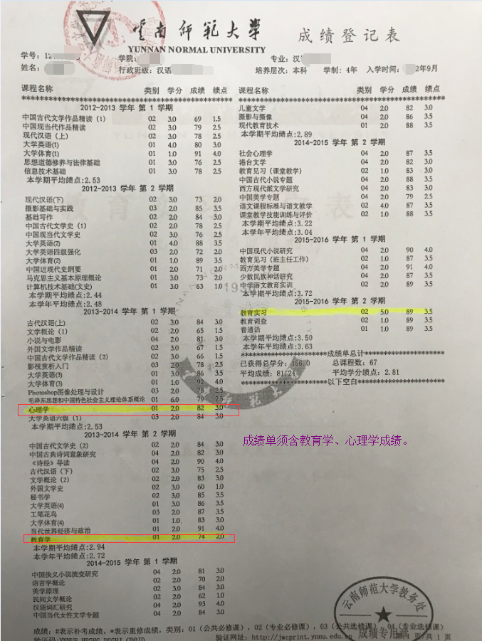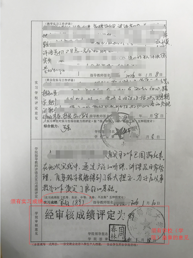 2016年及以前入學(xué)的全日制普通院校師范生、全日制教育碩士需提供含教育學(xué)、教育心理學(xué)的完整成績(jī)單和教育實(shí)習(xí)鑒定表的原件和復(fù)印件一份。參照樣式如下:
