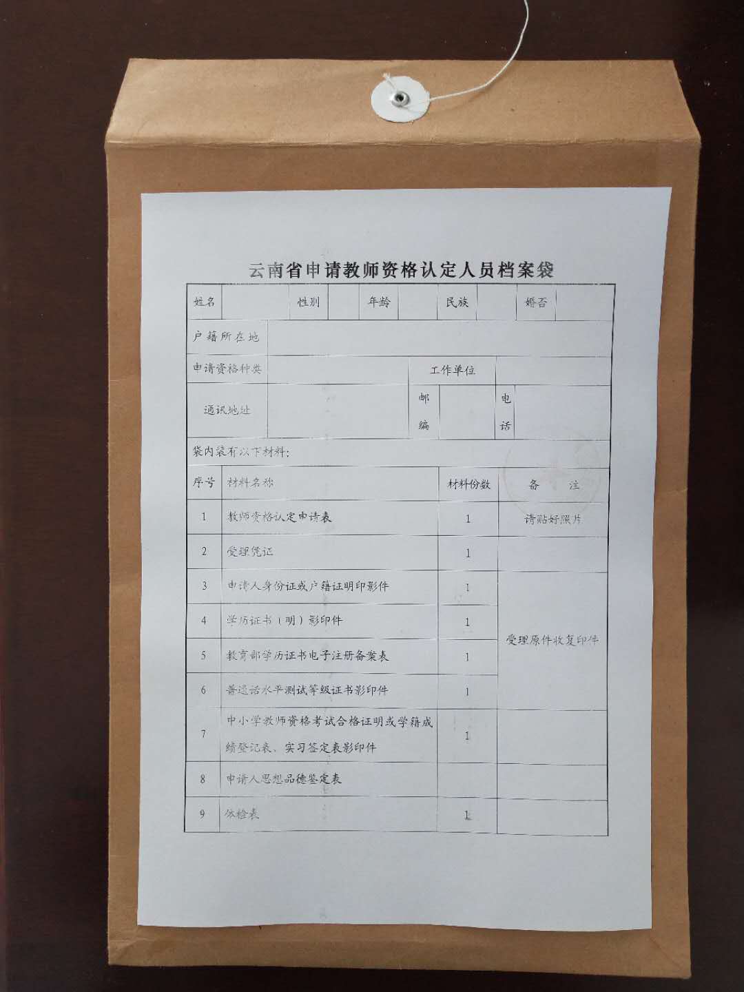 1)自購縱口檔安袋1個(gè)(封面粘貼:云南省申請(qǐng)教師資格認(rèn)定人員檔案袋)