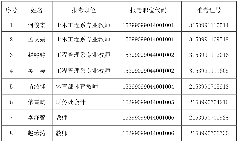 根據(jù)《云南水利水電職業(yè)學(xué)院2019年公開招聘工作人員公告》,經(jīng)筆試、資格復(fù)審、面試、體檢、考察等環(huán)節(jié),確定2019年學(xué)院公開招聘工作人員擬聘人員8人?,F(xiàn)將名單公示如下: