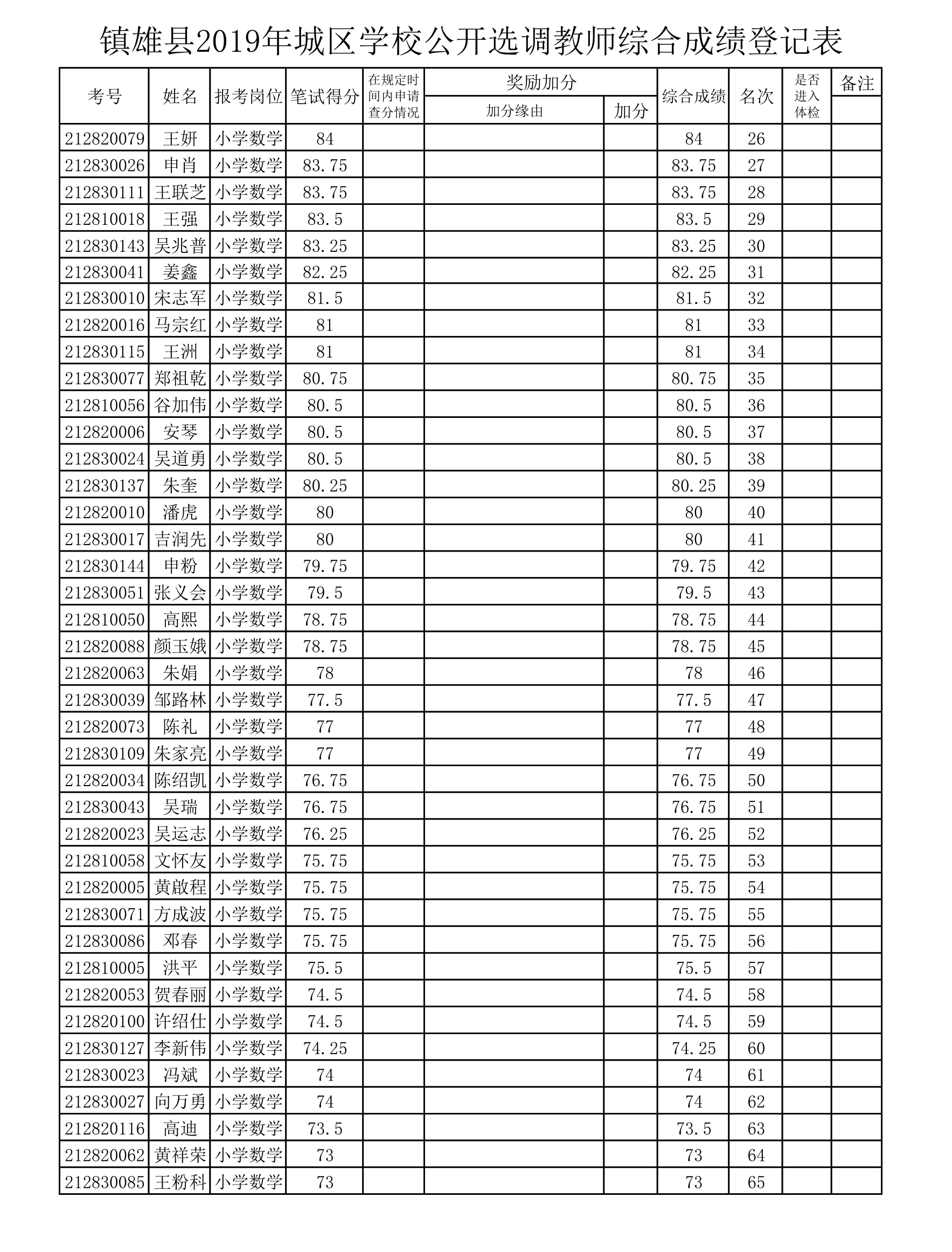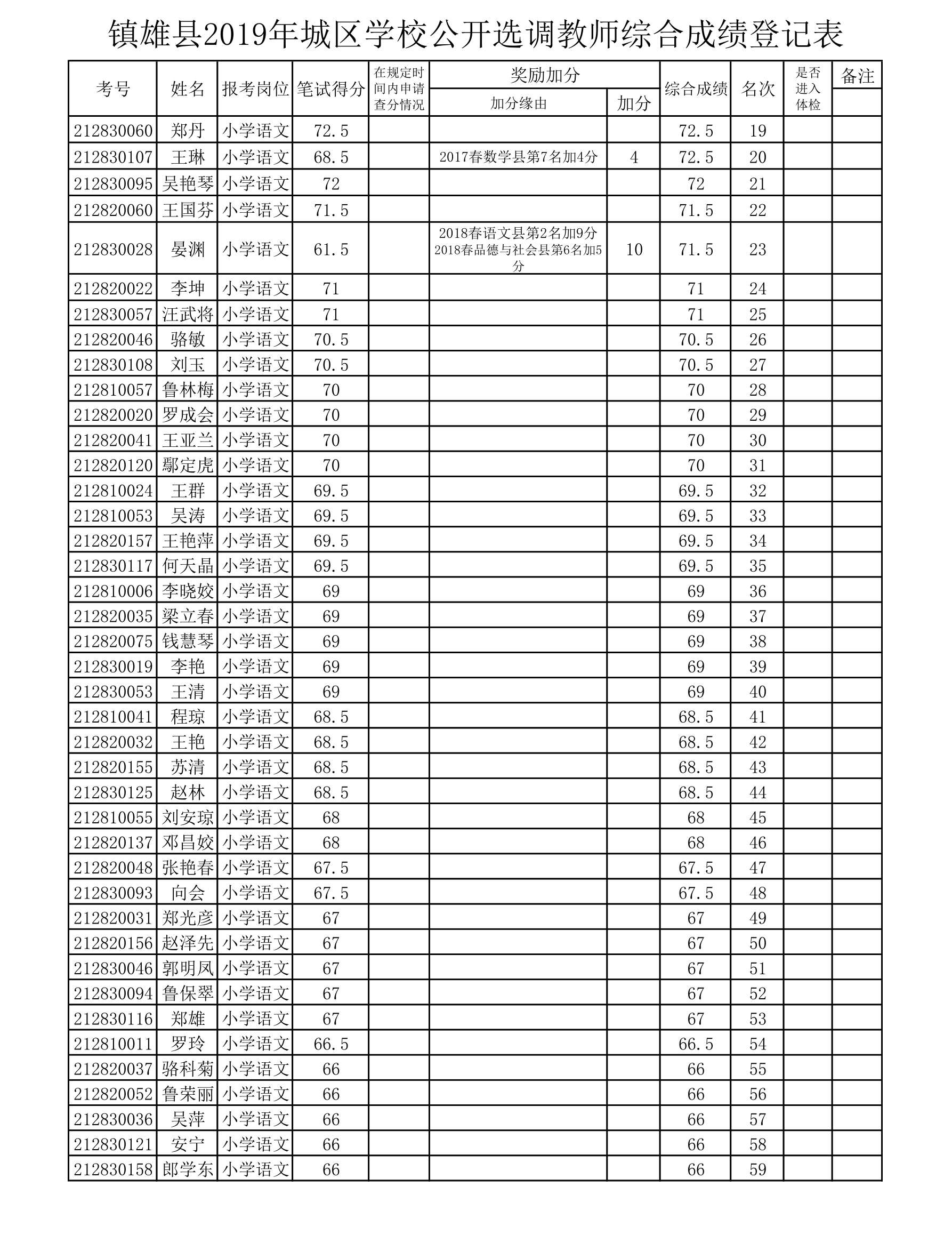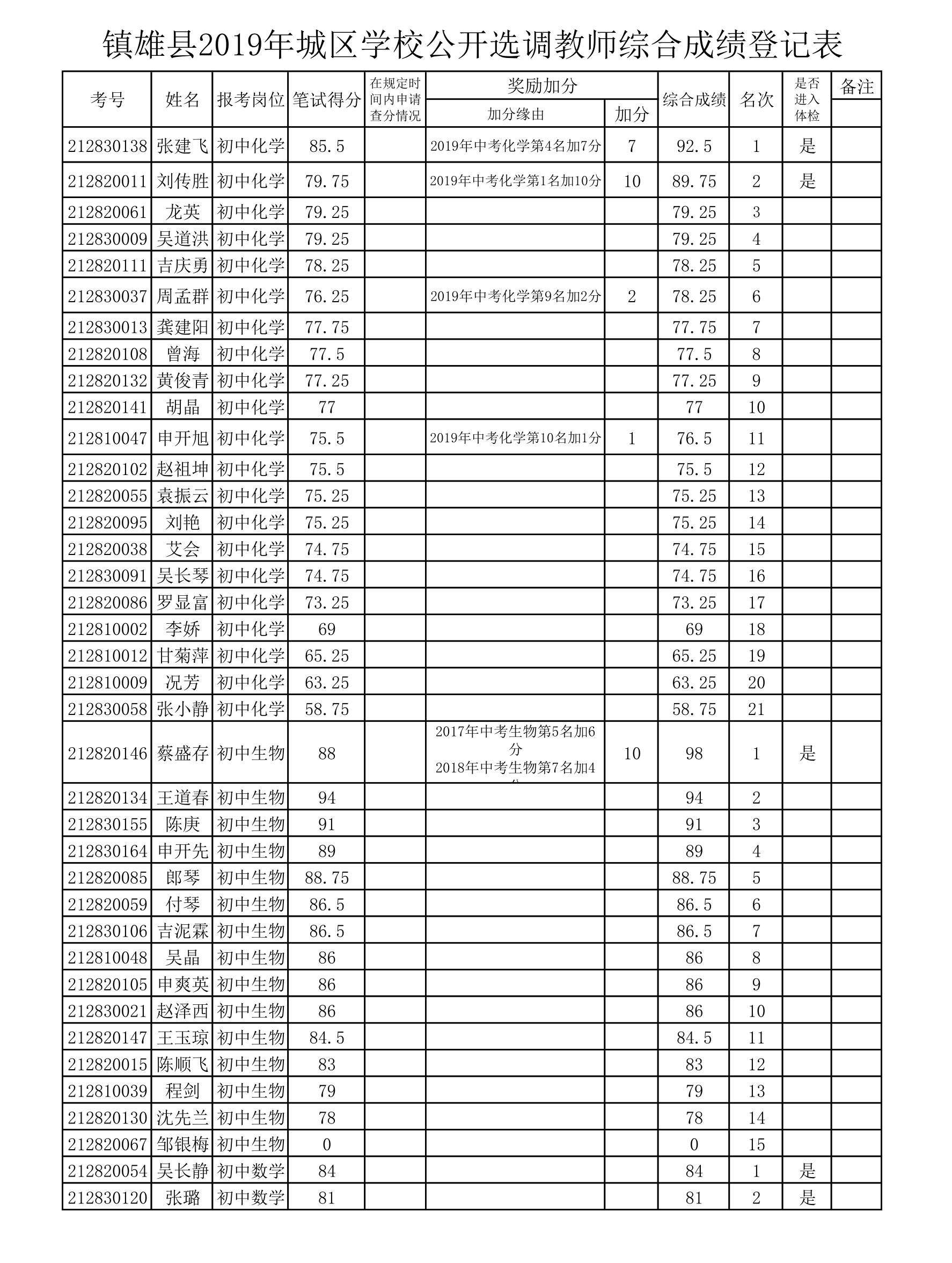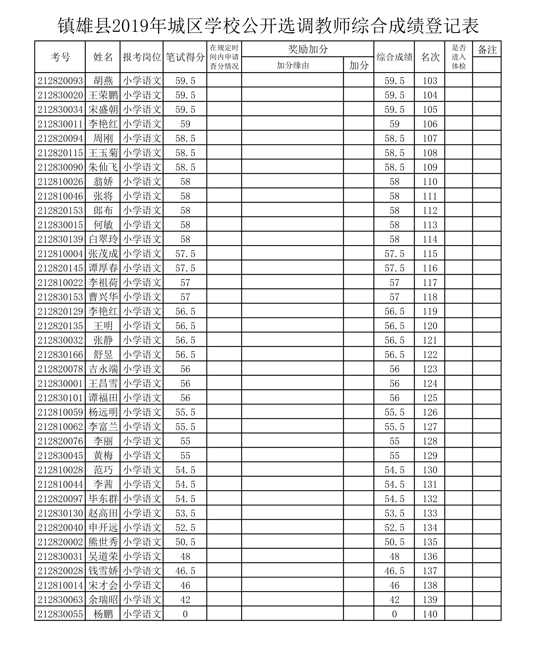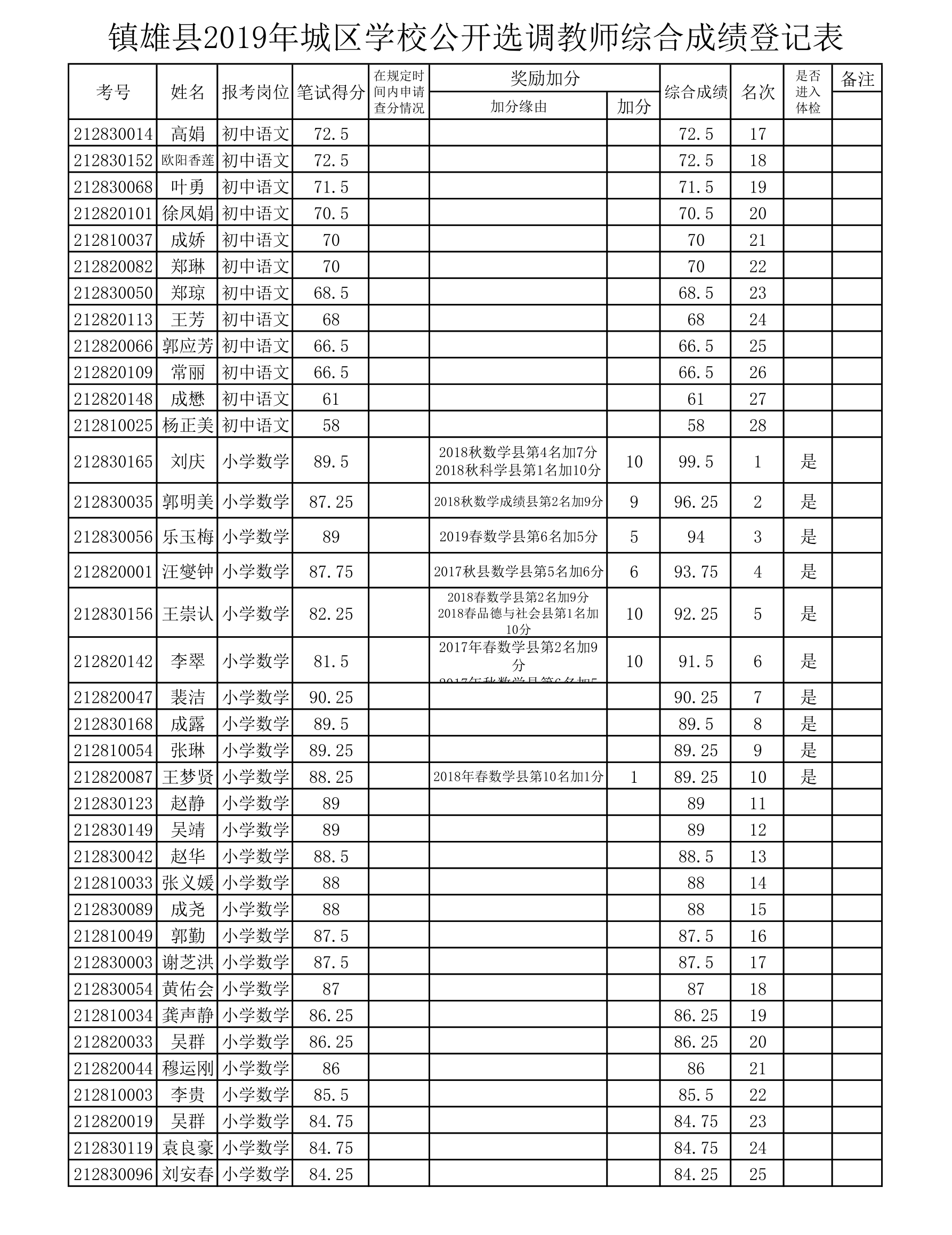 鎮(zhèn)雄縣教育體育局2019年城區(qū)學(xué)校公開選調(diào)教師綜合成績(jī)公示