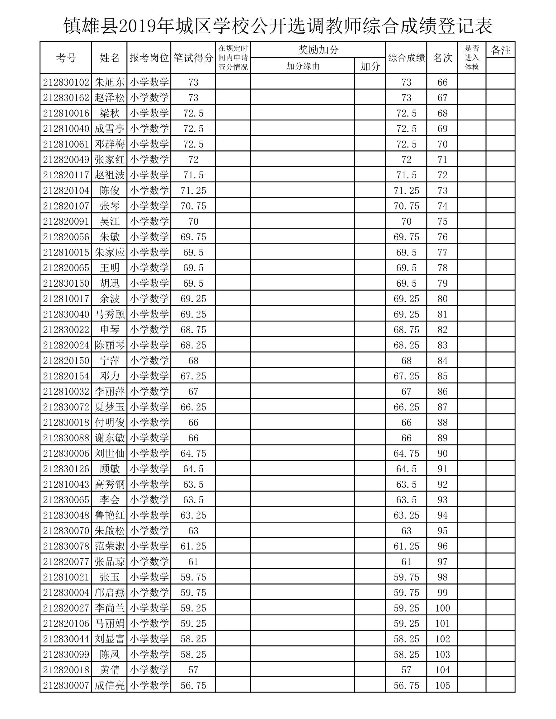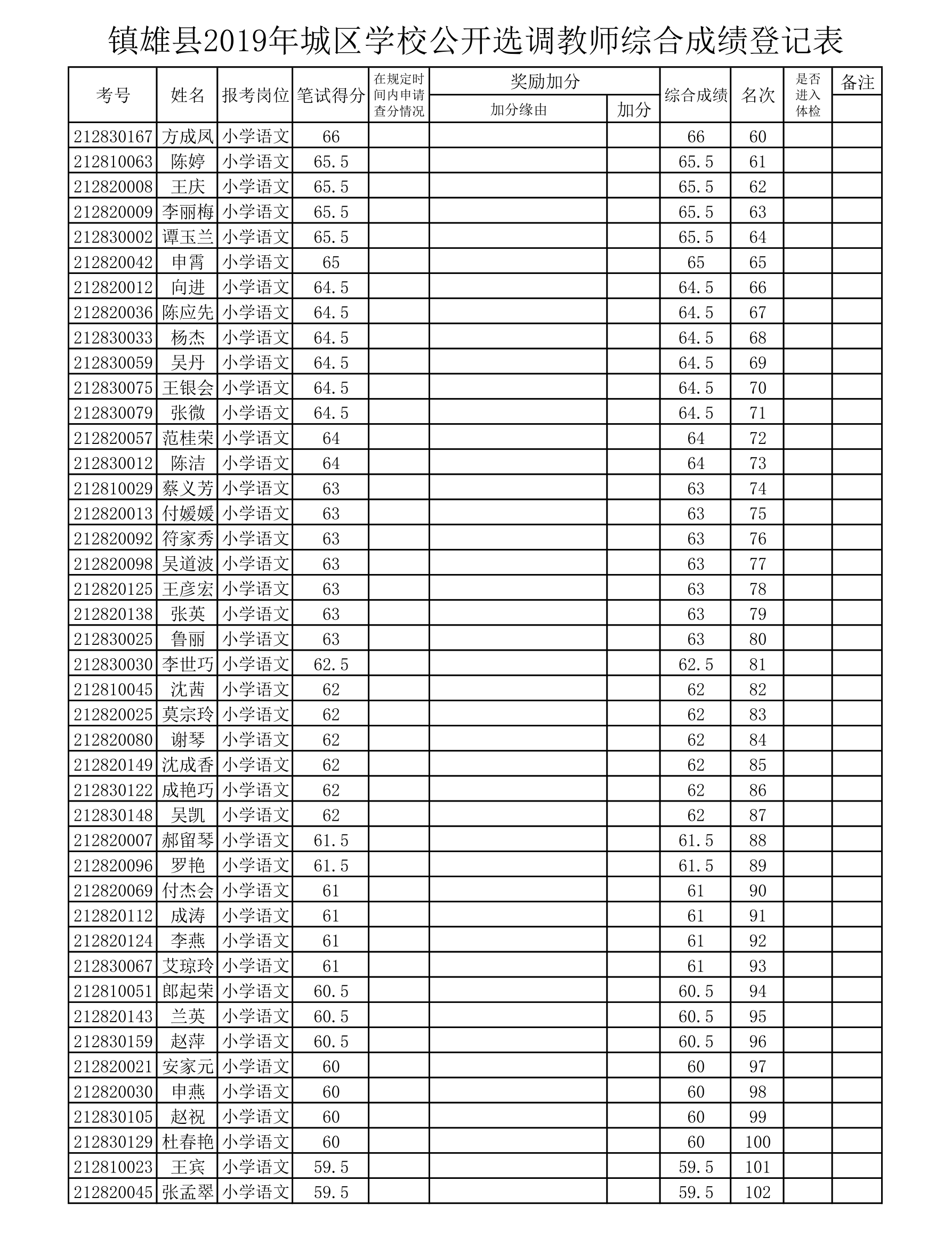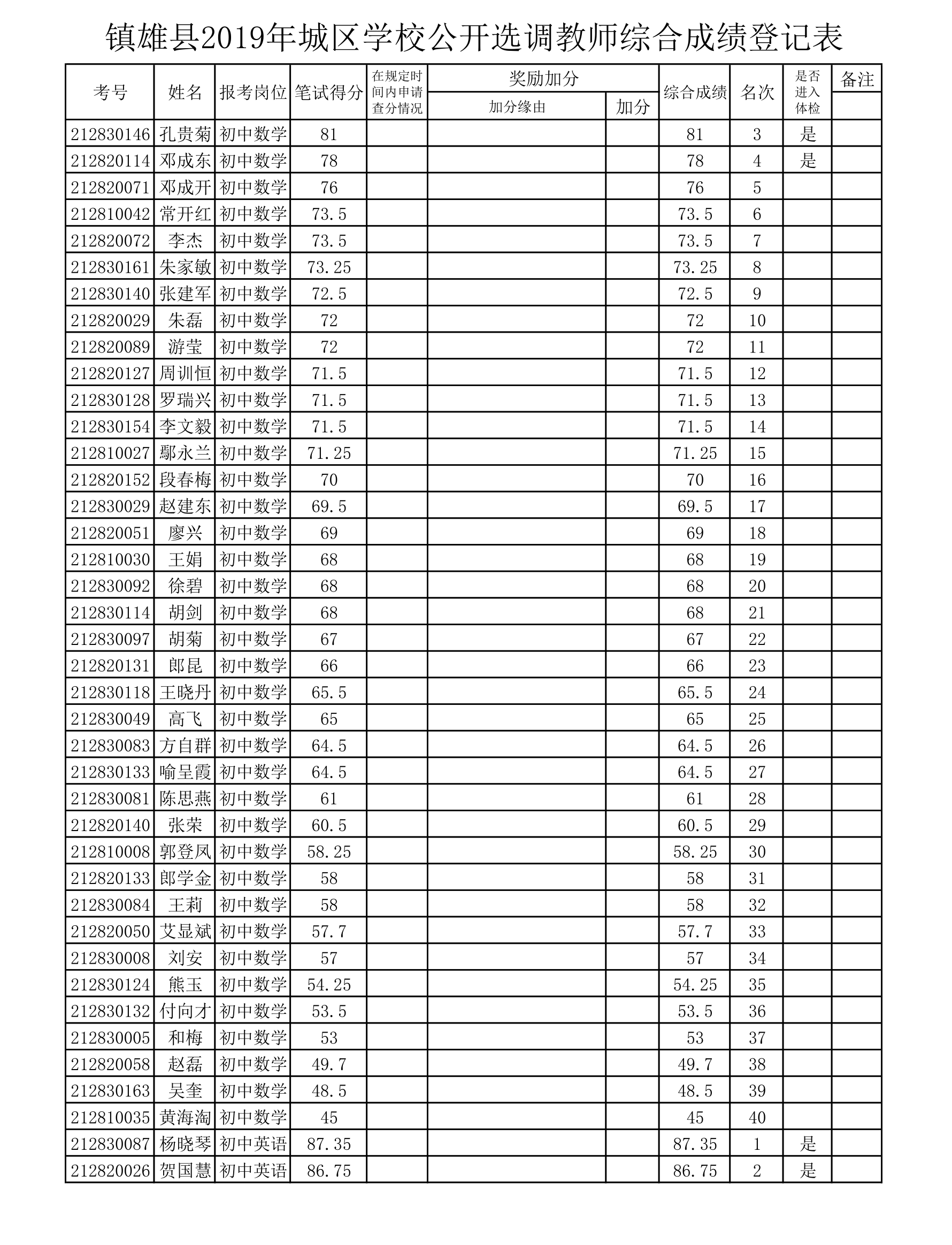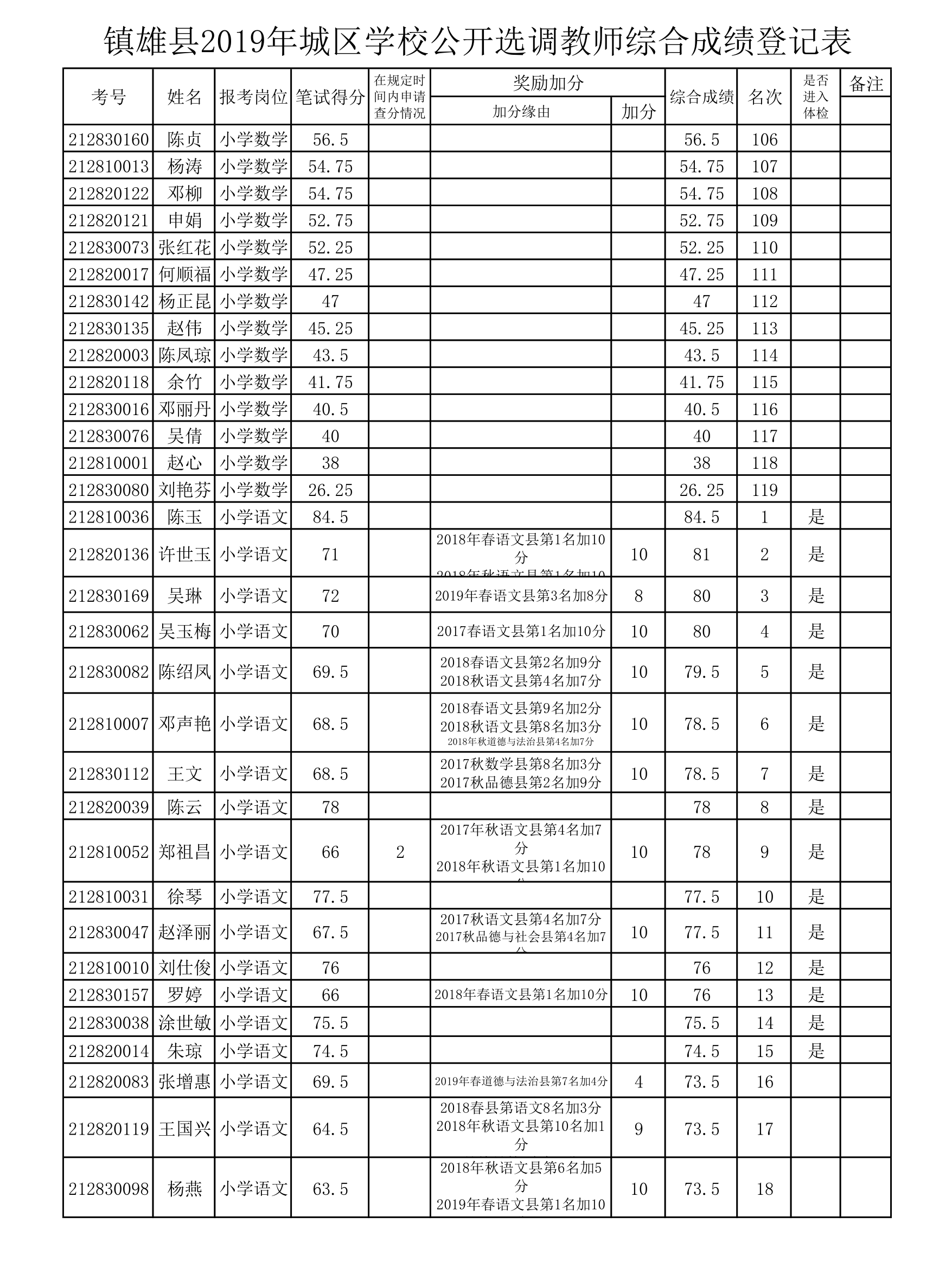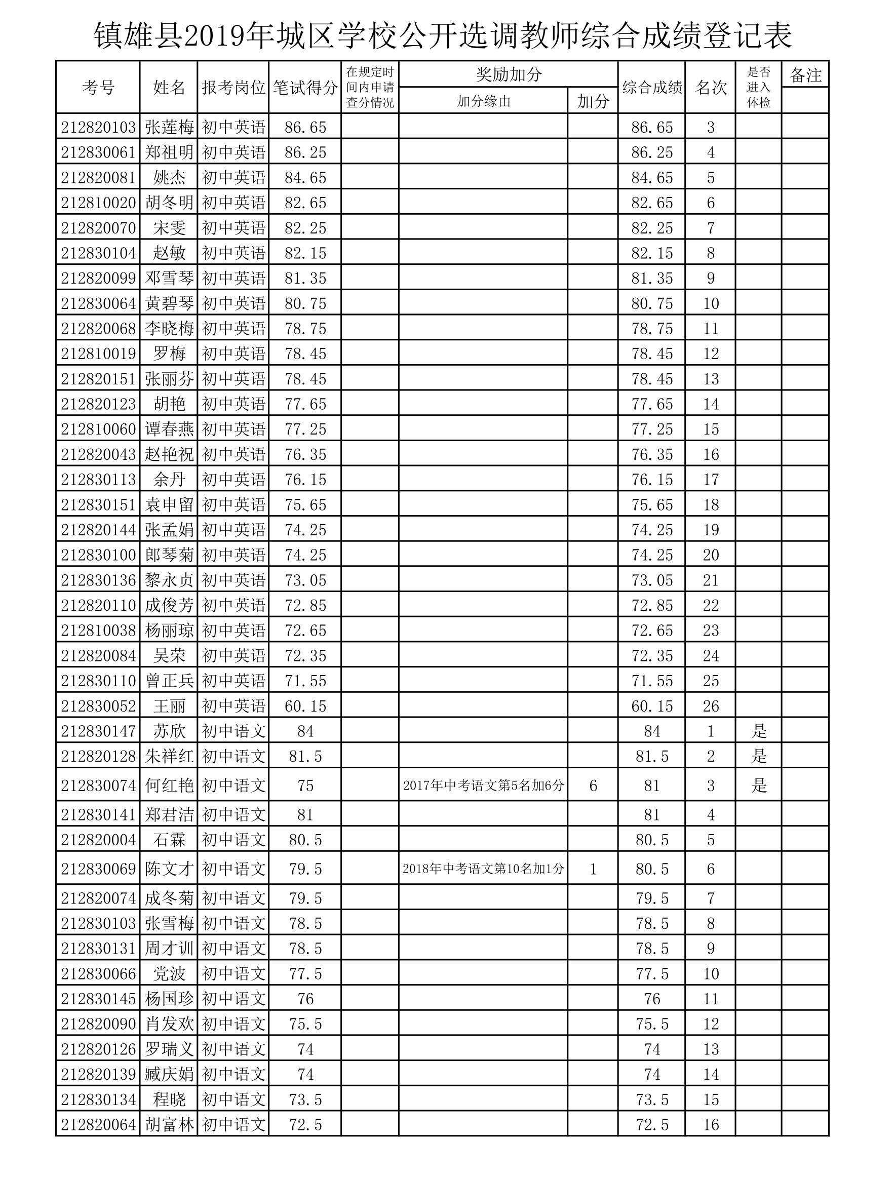 鎮(zhèn)雄縣教育體育局2019年城區(qū)學(xué)校公開選調(diào)教師綜合成績(jī)公示