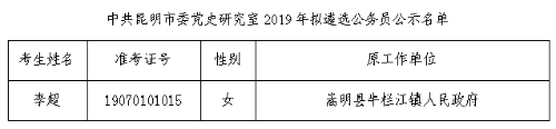 中共昆明市委黨史研究室2019年擬遴選公務(wù)員人選公示