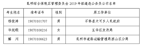 昆明綜合保稅區(qū)管理委員會(huì) 2019年擬遴選公務(wù)員人選公示