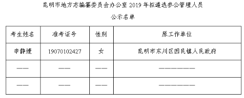 根據(jù)《昆明市2019年市級(jí)機(jī)關(guān)公開遴選公務(wù)員(參公管理人員)公告》有關(guān)規(guī)定,經(jīng)筆試、面試、考察和體檢等程序,昆明市地方志編纂委員會(huì)辦公室擬遴選李靜婕1名同志,現(xiàn)進(jìn)行公示。人選情況見附件。