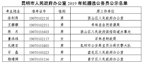 昆明市人民政府辦公室2019年擬遴選公務(wù)員人選公示