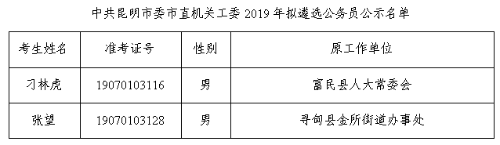 中共昆明市委市直機關(guān)工委2019年擬遴選公務(wù)員人選公示