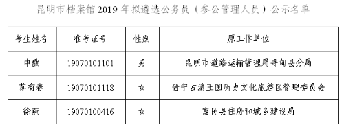 昆明市檔案館2019年擬遴選參公管理人員人選公示
