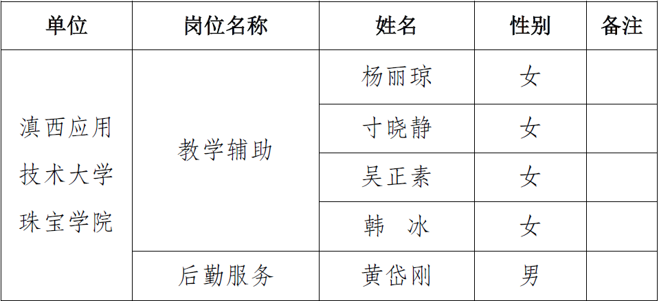 附件:滇西應(yīng)用技術(shù)大學(xué)珠寶學(xué)院2019年公開招聘政府購買服務(wù)勞務(wù)派遣教學(xué)輔助及后勤服務(wù)人員擬聘用人員名單