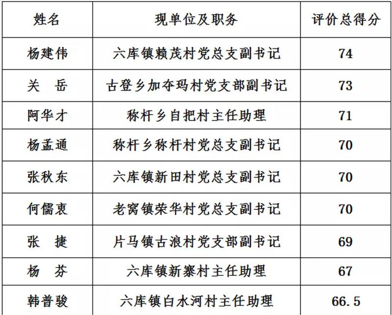 根據(jù)中共怒江州委組織部怒江州人力資源和社會保障局關(guān)于印發(fā)《2019年怒江州事業(yè)單位定向招聘大學(xué)生村官工作方案》的通知要求,對我市報考的18名大學(xué)生村官進(jìn)行了考核評價評分,現(xiàn)將考核評分結(jié)果公示如下(按分?jǐn)?shù)高低排名):