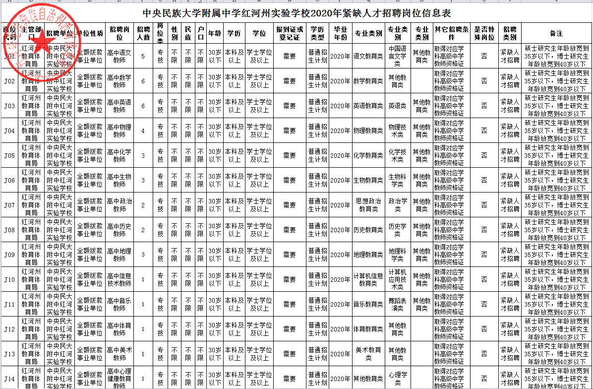 附件1:中央民族大學(xué)附屬中學(xué)紅河州實(shí)驗(yàn)學(xué)校2020年緊缺人才招聘崗位信息表.xls