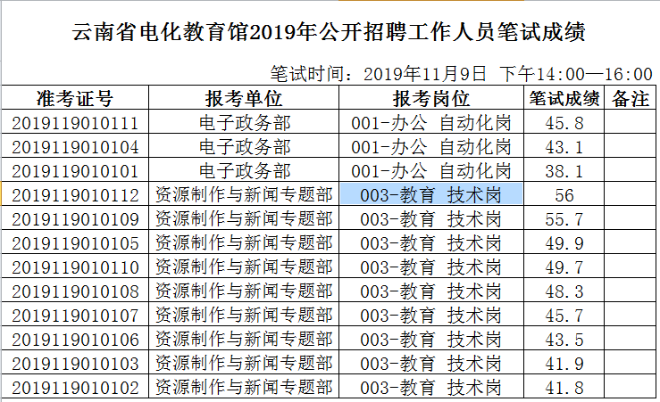 根據(jù)《云南省電化教育館 2019 年公開招聘工作人員公 告》規(guī)定,筆試成績(jī)?cè)诳荚嚱Y(jié)束后 5個(gè)工作日內(nèi),在云南人才市場(chǎng)、云南省教育廳門戶網(wǎng)站的公示公告欄目公布?,F(xiàn)將云南省電化教育館 2019 年公開招聘工作人員筆試成績(jī)進(jìn)行公告。資格復(fù)審及面試事項(xiàng)另行通知,考生可在云南省教育廳門戶網(wǎng)站公示公告欄目查看。