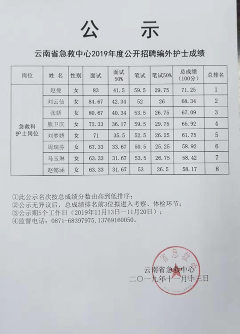 云南省急救中心2019年度公開(kāi)招聘編外護(hù)士成績(jī)公示