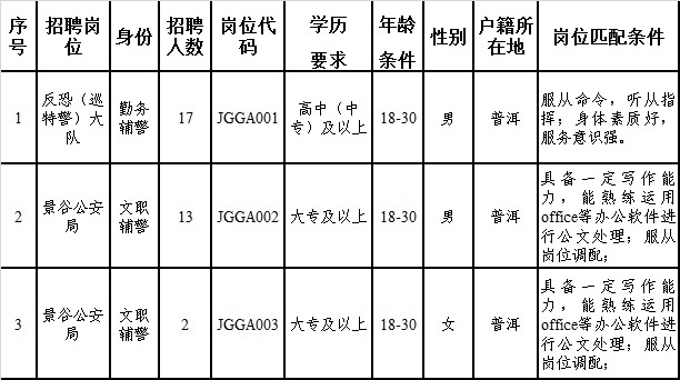 1、2019年景谷傣族彝族自治縣公安局公開(kāi)招聘文職人員和勤務(wù)輔警崗位設(shè)置表。