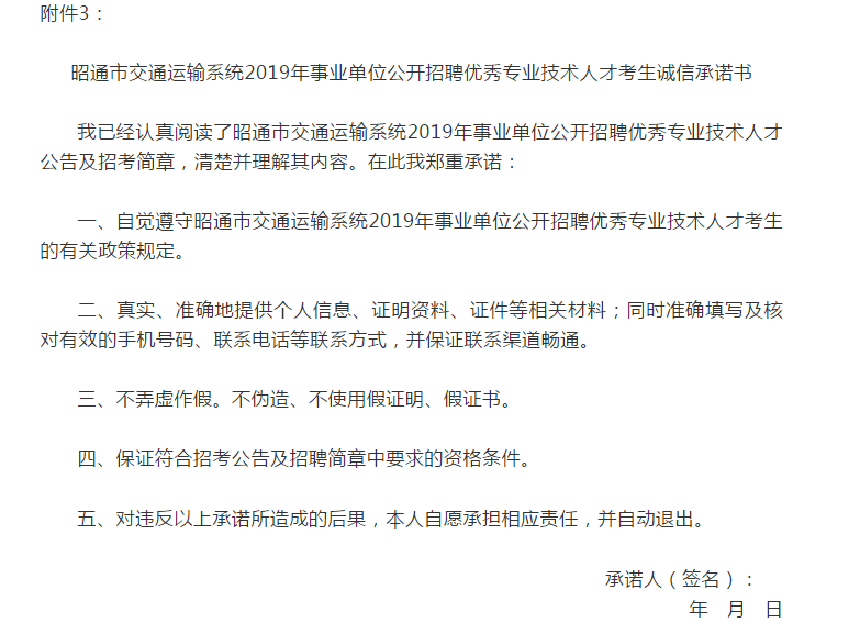 3.昭通市交通運(yùn)輸系統(tǒng)2019年事業(yè)單位公開招聘優(yōu)秀專業(yè)技術(shù)人才考生誠信承諾書