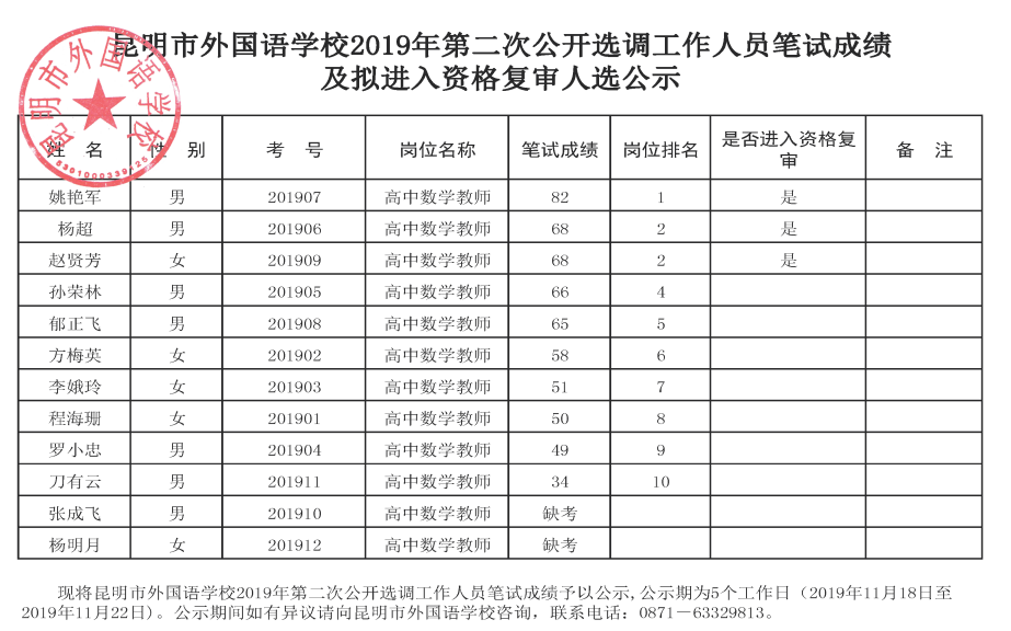 昆明市外國(guó)語(yǔ)學(xué)校2019年第二次公開(kāi)選調(diào)工作人員筆試成績(jī)及擬進(jìn)入資格復(fù)審人選公示