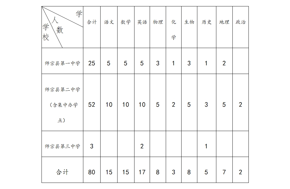 為加強師宗縣教師隊伍建設,經(jīng)縣委、縣政府同意,曲靖市師宗縣教育體育局決定面向全國師范大學類本科大學(不包含師范類學院)(名單見附件1)2020年畢業(yè)的優(yōu)秀學生,公開招聘中學教師80名,現(xiàn)公告如下。