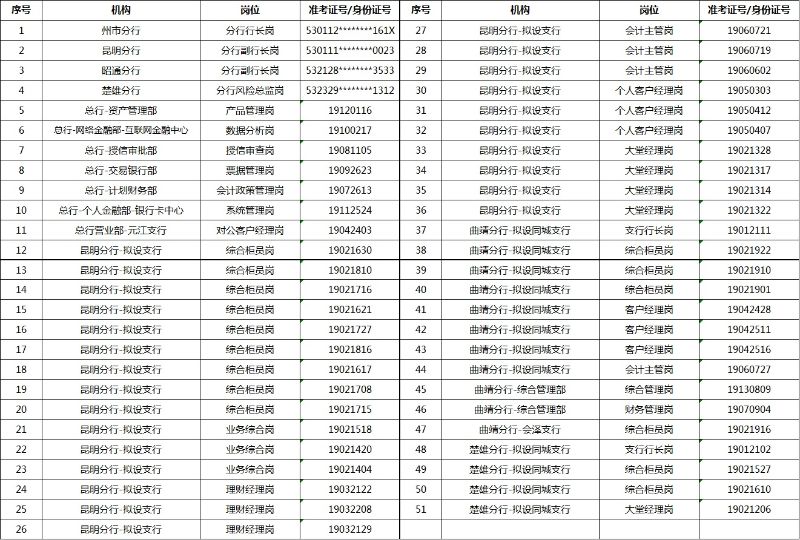 2.由于總行營業(yè)部元江支行理財經(jīng)理崗、曲靖分行擬設(shè)同城支行理財經(jīng)理崗參考人員綜合成績均未達(dá)到60分,故本次社會招聘取消上述崗位的招錄。