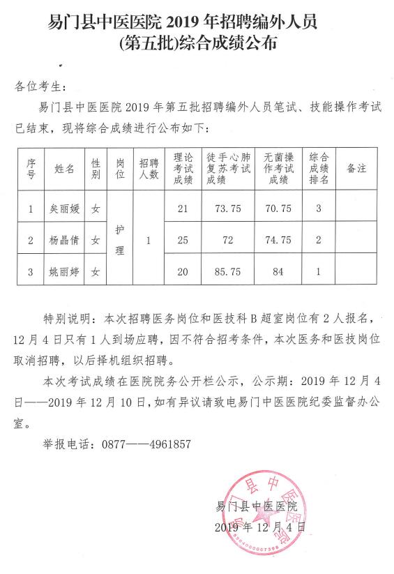易門(mén)縣中醫(yī)醫(yī)院2019年招聘編外人員(第五批)綜合成績(jī)公布