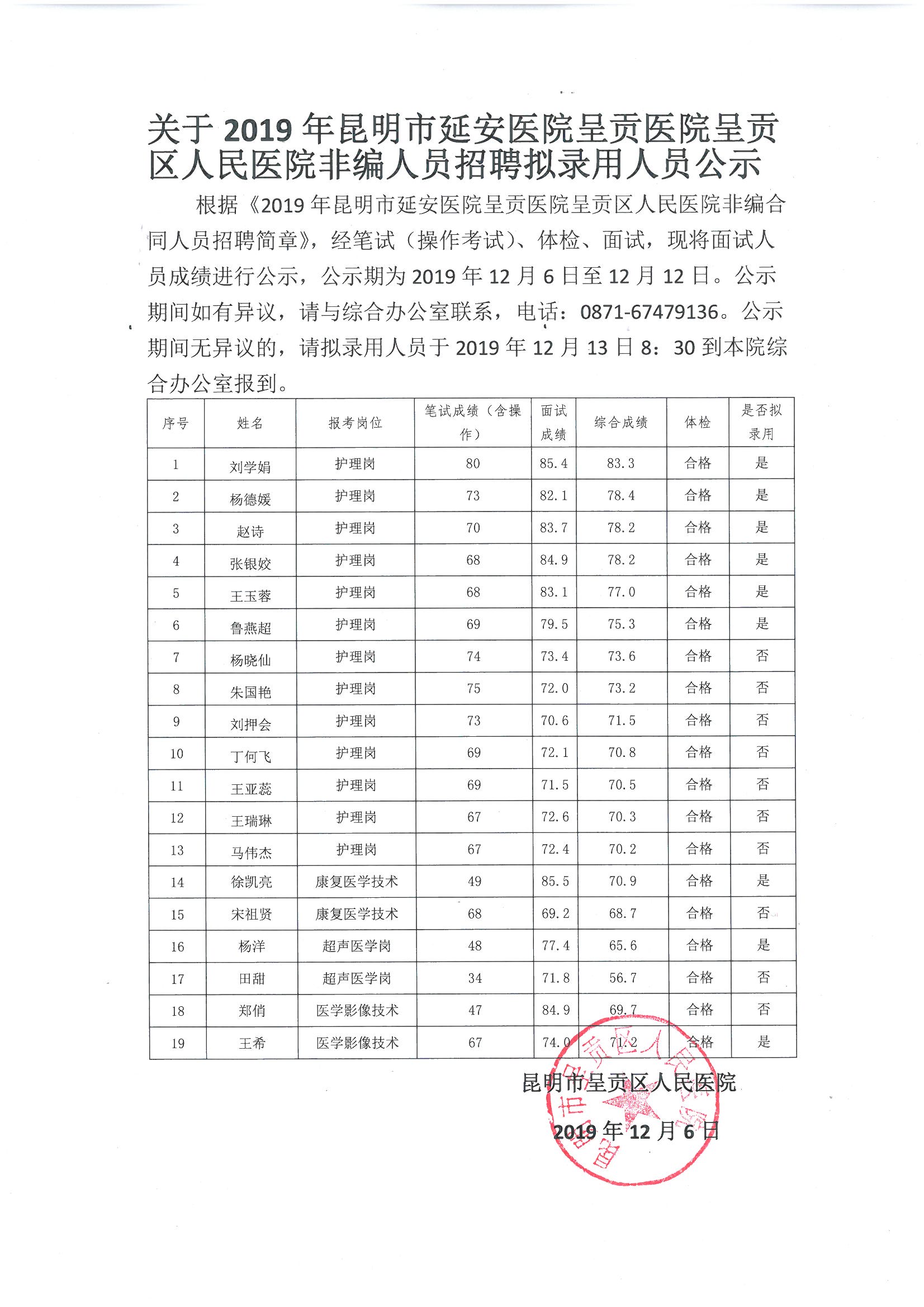 關(guān)于2019年昆明市延安醫(yī)院呈貢區(qū)人民醫(yī)院非編人員招聘擬錄用人員公示