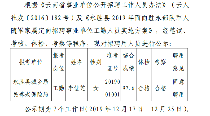 永勝縣2019年面向駐永部隊軍人隨軍家屬定向招聘事業(yè)單位工勤人員公示
