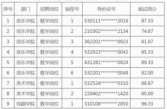 云南藝術(shù)學(xué)院2019年第二次公開(kāi)招聘工作人員面試成績(jī)公示