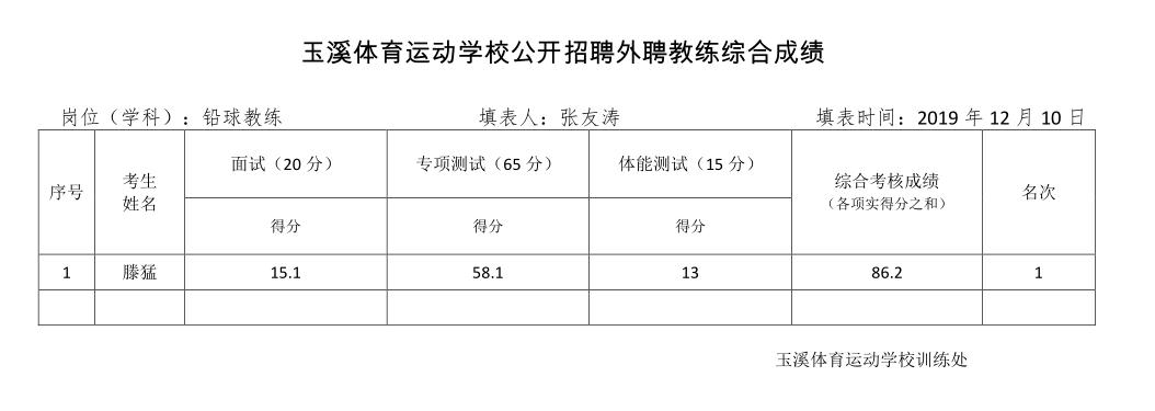 玉溪體育運動學(xué)校公開招聘外聘教練綜合成績