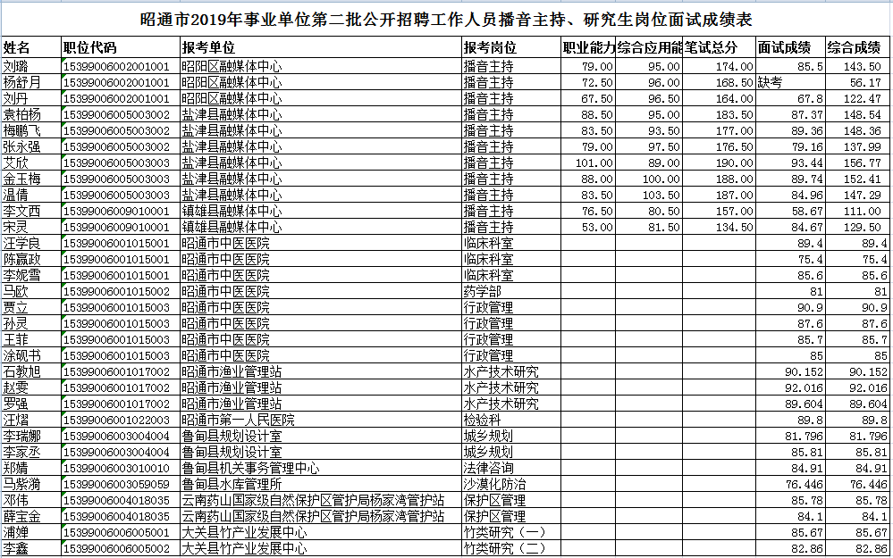 根據(jù)《昭通市2019年事業(yè)單位第二批公開招聘工作人員通告(第一號)》的規(guī)定,相關(guān)招聘單位、主管部門及縣(市、區(qū))人社局分別對崗位要求為碩士研究生及以上學(xué)歷(須具有碩士及以上學(xué)位)的報考人員和播音主持崗位人員進(jìn)行了面試,現(xiàn)將面試成績予以公布。