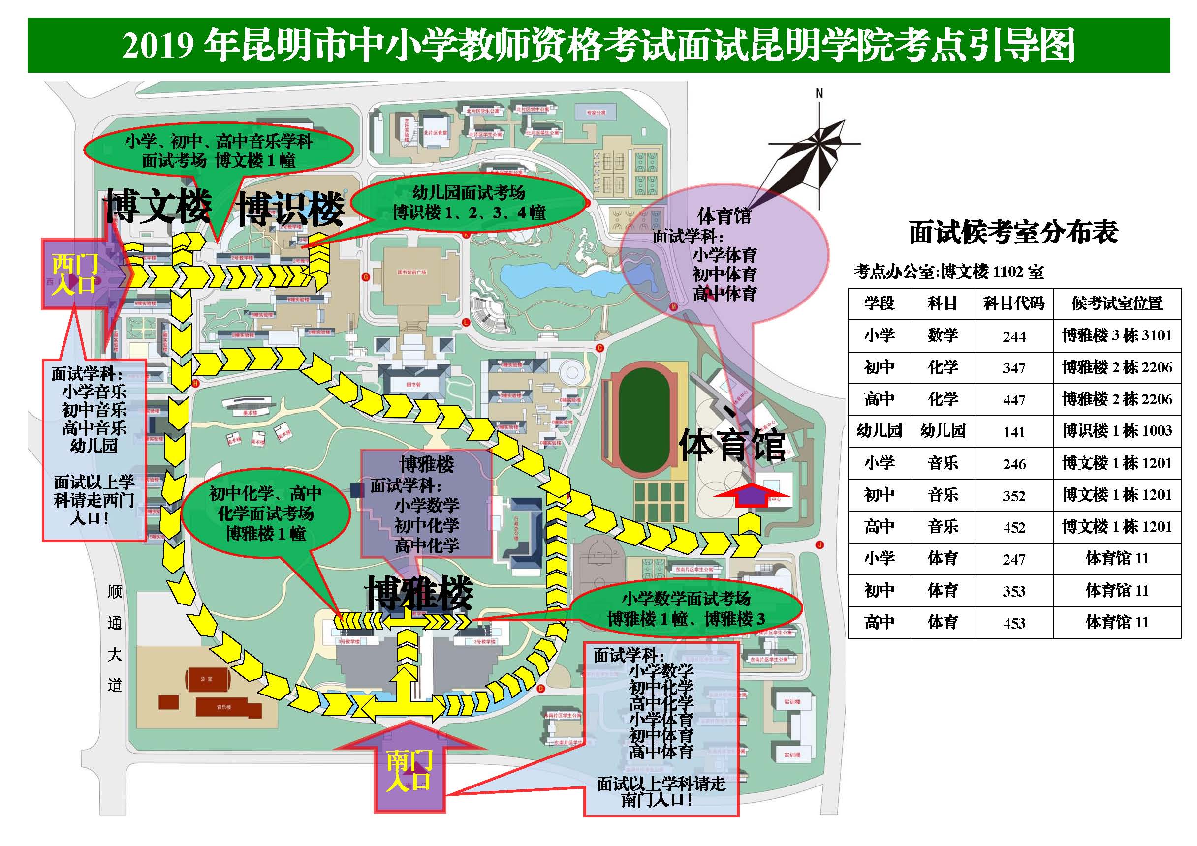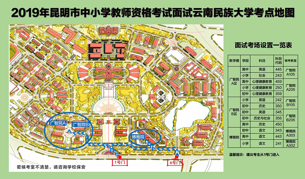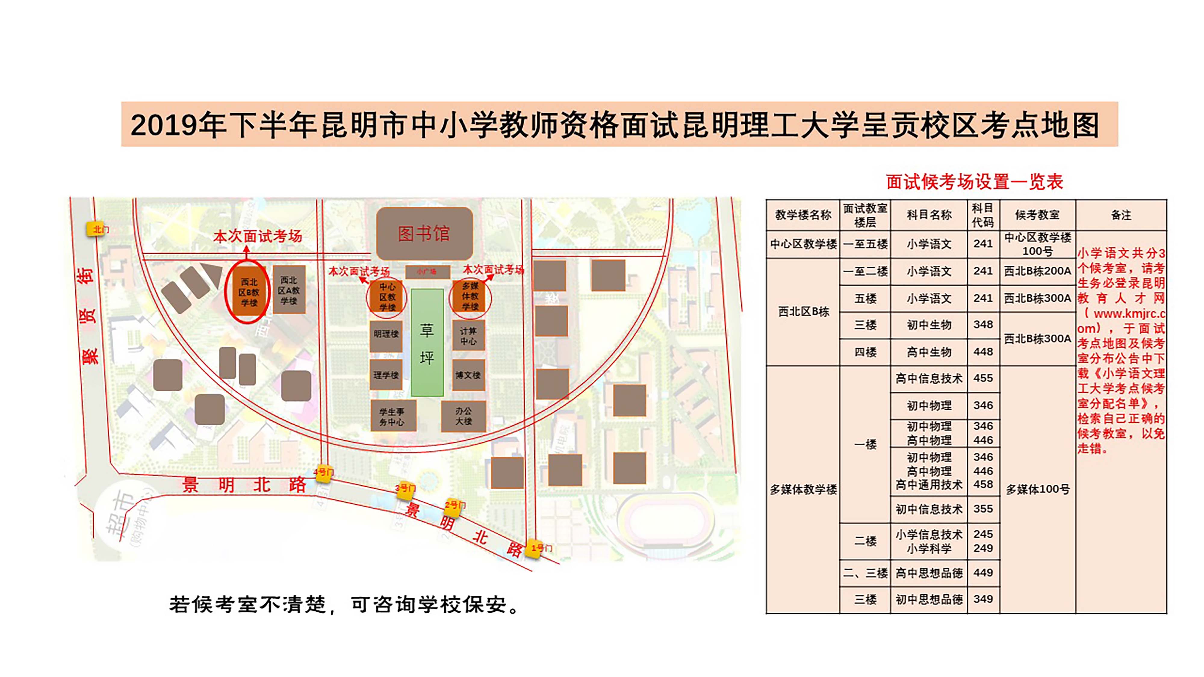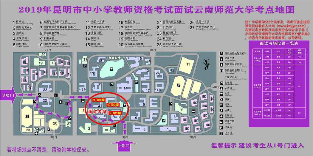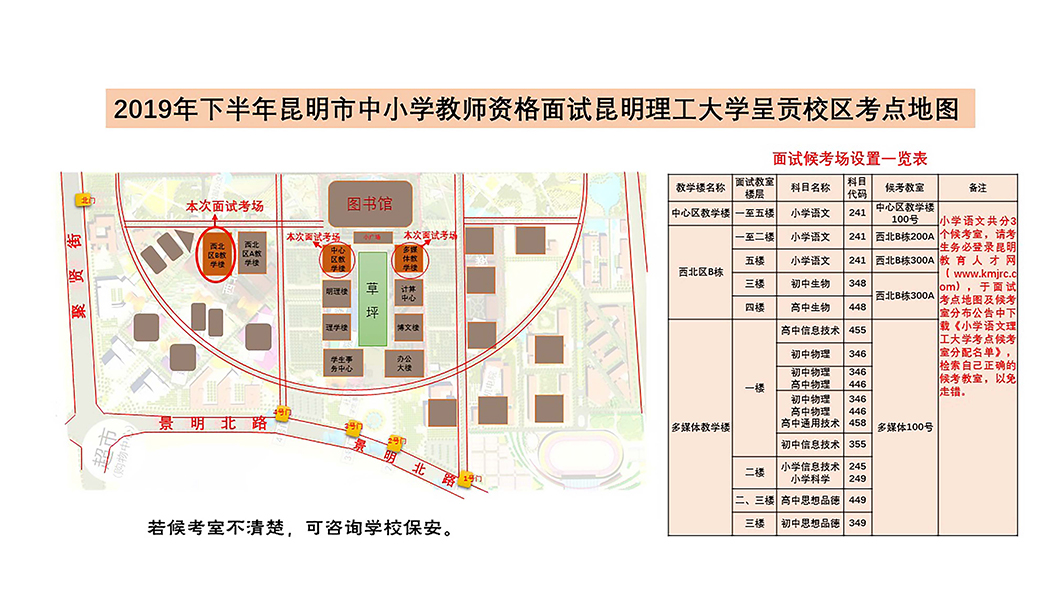 各面試考點(diǎn)均按面試科目對(duì)應(yīng)設(shè)置了候考室,各位考生務(wù)必對(duì)照考點(diǎn)地圖中《面試考場(chǎng)設(shè)置一覽表》,按學(xué)科找準(zhǔn)并記住自己的正確的候考教室,以免走錯(cuò)。其中,因部分科目考生人數(shù)眾多、考點(diǎn)單一候考教室容納不下考生的客觀因素,云南師范大學(xué)考點(diǎn)——小學(xué)數(shù)學(xué)科目設(shè)置了2個(gè)候考教室,昆明理工大學(xué)——小學(xué)語(yǔ)文科目設(shè)置了3個(gè)候考教室。為保障面試順利進(jìn)行,昆明市對(duì)這兩個(gè)考點(diǎn)的小學(xué)數(shù)學(xué)、小學(xué)語(yǔ)文兩個(gè)科目的考生進(jìn)行了候考教室的分配指定(人員分配名單詳見(jiàn)附件)。請(qǐng)考生務(wù)必嚴(yán)格對(duì)照分配名單檢索自己正確的候考教室,以免走錯(cuò)。