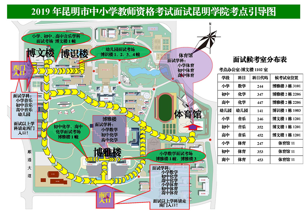 按照《云南省2019年下半年中小學(xué)教師資格考試(面試)公告》,昆明市2019年下半年中小學(xué)教師資格面試將于2020年1月4日-5日進(jìn)行,為廣大考生能順利參加面試,現(xiàn)將考點(diǎn)地圖及候考室分布及有關(guān)事項(xiàng)公告如下: