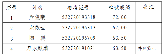 根據(jù)《普洱市衛(wèi)生健康委員會(huì)2019年公開遴選事業(yè)單位工作人員公告》(第1號(hào)),普洱市衛(wèi)生健康委員會(huì)于2019年12月7日組織開展了“普洱市人民醫(yī)院口腔醫(yī)師職位(職位代碼C003001)”“普洱市中醫(yī)醫(yī)院臨床醫(yī)師職位(崗位代碼C005002)”“普洱市第二人民醫(yī)院財(cái)務(wù)會(huì)計(jì)職位(職位代碼C004001)”“普洱市婦幼保健院辦公室綜合管理職位(崗位代碼C006002)”公開遴選的筆試工作?,F(xiàn)將有關(guān)事項(xiàng)公告如下: